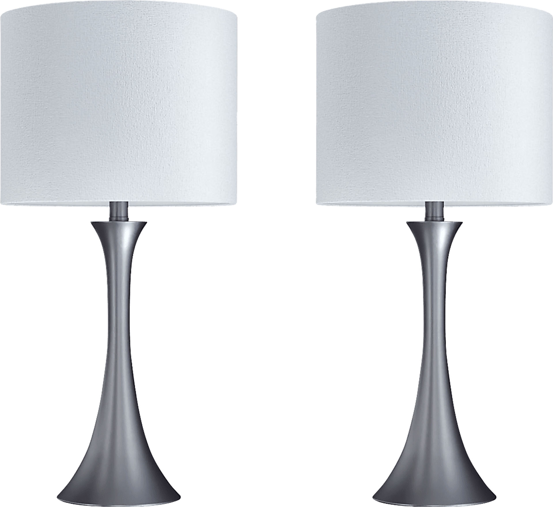 The Keely Alley lamp, set of 2 showcases an eye-catching hourglass figure with a dramatic flaring bottom half, all in a beautiful frosted slate finish. Topped by tapered drum shades wrapped in white linen fabric, this table lamp set will add a dash of modern style to any room. Whether resting on your nightstands, set on a side table in the den, or tucked into your favorite reading nook, this lamp set is a chic addition to any aesthetic. Partial assembly may be required.