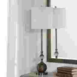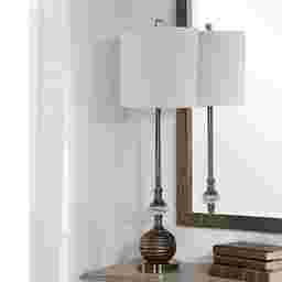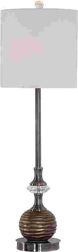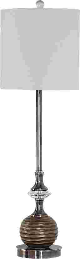 Include the Keen Boulevard lamp in your transitional styled home for an eye catching look. A bronze textured sphere highlights the brushed nickel and crystal accents. The drum hardback shade is a white linen fabric with light slubbing. Partial assembly may be required.