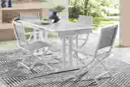 Warmth, form and function syncing in perfect harmony is how the Kellen patio collection makes belonging feel like second nature. Crafted with a rust-resistant aluminum frame in a white finish, this dining table features a durable plank-style tabletop in light gray with a sleek double pedestal base. Always ready to accommodate more guests, a pop-out lever conveniently extends the tabletop from 63" to 82.75".