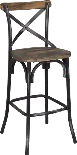 The Keller Trace brown barstool offers a vintage style inspired by Parisian bistro chairs. It features reclaimed wood and metal looks, simple "X" style backrest, wooden seat, and slightly flared four-legged base with footrest supports. Some customer assembly required.