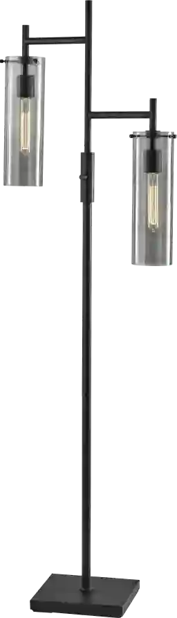 With clean, simple lines, a black metal finish, and vintage Edison bulbs, the Killingrew Hills floor lamp integrates seamlessly with industrial and modern chic styling. This lamp's dual-light design is ideal for illuminating larger bedrooms, dining rooms, and living areas. Anchored by a 10 square base crafted of black metal, a matching narrow pole extends straight before intersecting two short arms at 90 degree angles. The arms are positioned at varying heights and extend in opposing directions for an asymmetric design. Suspended from each arm is a luxuriously styled smoked glass cylindrical shade that leaves the included 40W Edison tube bulb visible for striking, vintage appeal. The lamp is easily operated by a discreet rotary switch located on the pole. Partial assembly may be required.