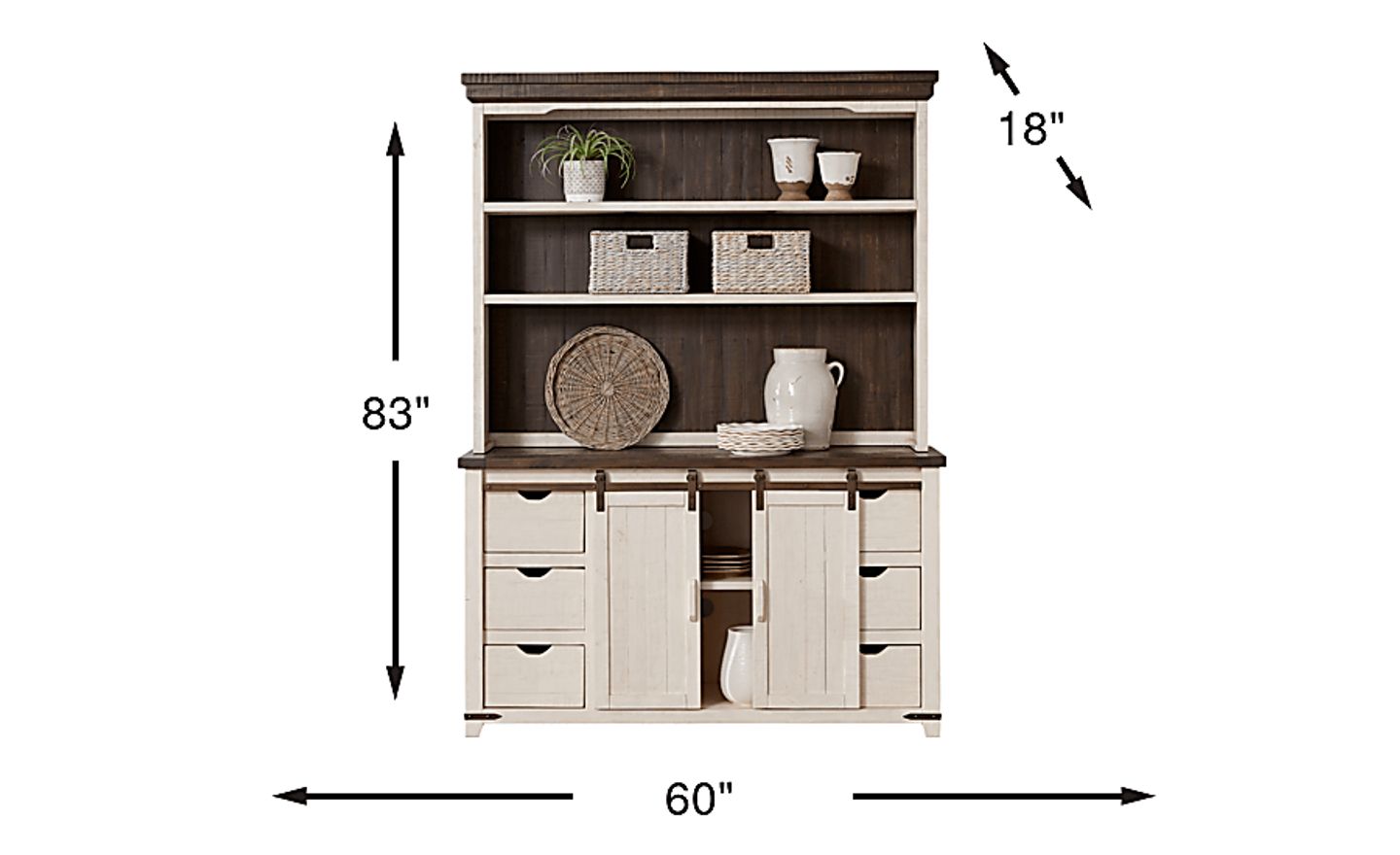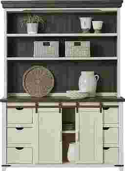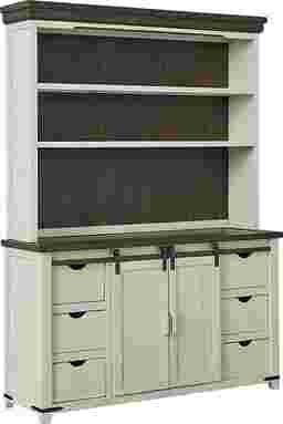 Get organized and on-trend with the Kenbridge 2 pc server and hutch. This practical farmhouse style piece offers plenty of room for your dining essentials. The hutch, with two long shelves, provides the perfect space-savvy storage and display space. The server has an adjustable shelf concealed by sliding doors on the center of the piece. Six drawers made with sturdy French dovetail joints on the front provides concealed space for any number of items. Crafted with pine solids, the server and hutch have an antique white finish contrasted by a barnwood (gray-brown) finished top and backboard. Industrial-inspired metal accents add the last stylish touch.