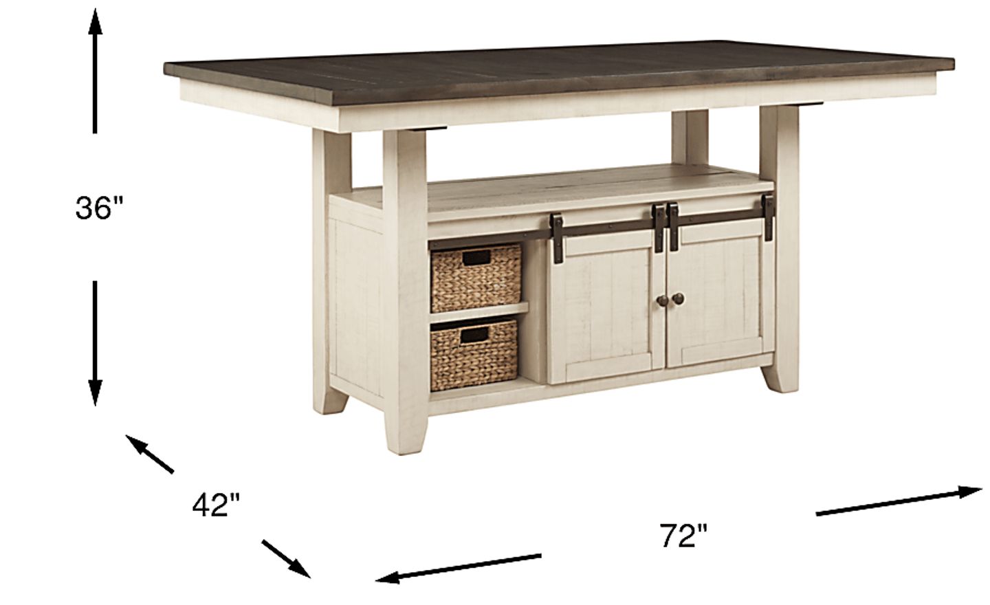 Make the most of your casual dining area with the Kenbridge counter height table. The 42 x 72 inch rectangular top in a barnwood (gray-brown) finish and Industrial-inspired metal accents offer a beautiful contrast to the table's antique white finish. Built-in shelves, fronted by sliding doors, are accessible from either side of the base and provide practical and convenient storage. The farmhouse aesthetic creates a welcoming, relaxed sense of style. (Baskets shown not included.)