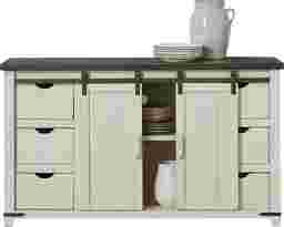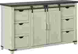 Get on-trend and organized with the Kenbridge server. This practical farmhouse style piece offers plenty of storage and a smooth top for displaying decorative items or serving trays when entertaining. An adjustable shelf is concealed by sliding doors on the center of the server. Six drawers made with sturdy French dovetail joints on the front provides concealed space for any number of dining necessities. Crafted with pine solids, the server has an antique white finish contrasted by a barnwood (gray-brown) finished top. Industrial-inspired metal accents add the last stylish touch.