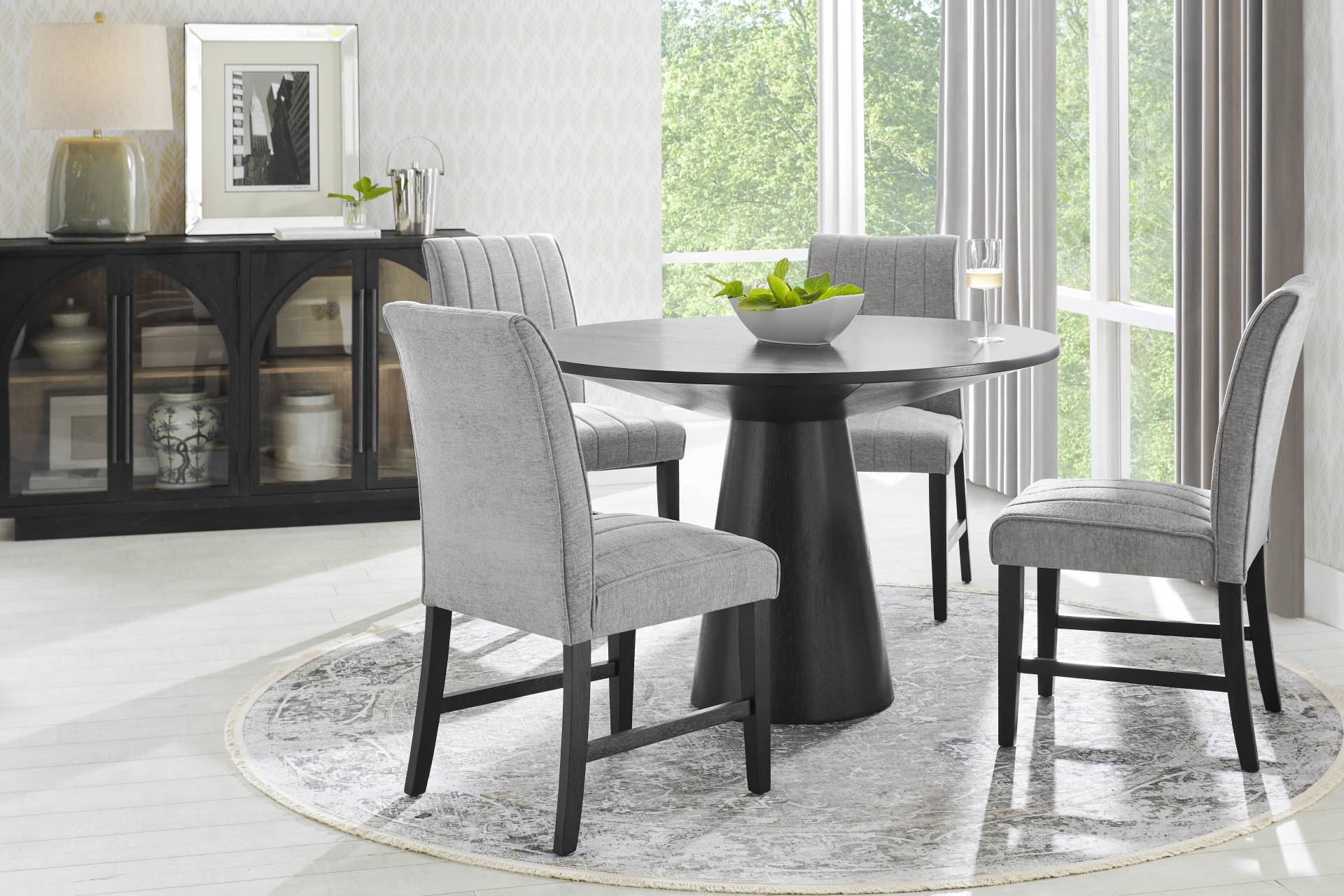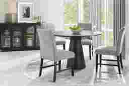 You've got a reservation for the hottest dining experience in town, and the Kendall collection is serving it family-style. A 48" round table anchors this trendy dining room, featuring a contemporary tabletop and flared pedestal base in a black finish. Matching side chairs with tapered wood legs showcase channeling details stitched into gray upholstery for a crisp, tailored look. A compact footprint makes this room ideal for smaller spaces such as apartments or condos.
