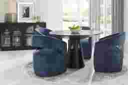 You've got a reservation for the hottest dining experience in town, and the Kendall collection is serving it family-style. A 48" round table anchors this trendy dining room, featuring a contemporary tabletop and flared pedestal base in a black finish. Included side chairs, upholstered top to bottom in velvety navy fabric, bring a unique swivel base design to the table for contemporary flair and curved backs for lavish comfort.