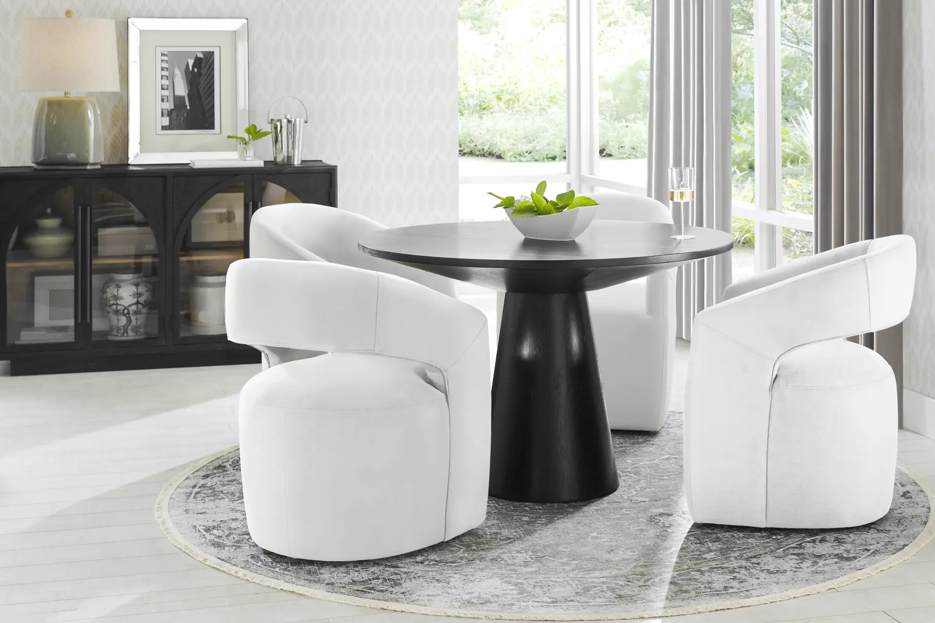 You've got a reservation for the hottest dining experience in town, and the Kendall collection is serving it family-style. A 48" round table anchors this trendy dining room, featuring a contemporary tabletop and flared pedestal base in a black finish. Included side chairs, upholstered top to bottom in velvety white fabric, bring a unique swivel base design to the table for contemporary flair and curved backs for lavish comfort.
