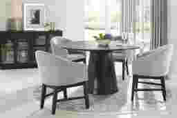 You've got a reservation for the hottest dining experience in town, and the Kendall collection is serving it family-style. A 59" round table anchors this trendy dining room, featuring a contemporary tabletop and flared pedestal base in a black finish. Matching side chairs with tapered wood legs showcase curved backs and seats fully upholstered in gray for a crisp, tailored look.