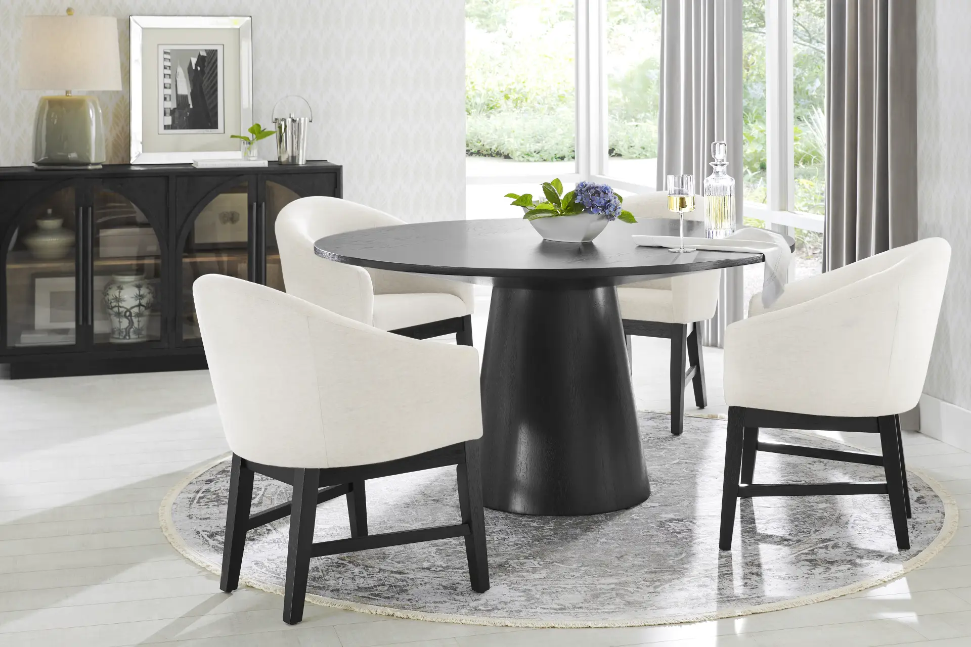 You've got a reservation for the hottest dining experience in town, and the Kendall collection is serving it family-style. A 59" round table anchors this trendy dining room, featuring a contemporary tabletop and flared pedestal base in a black finish. Matching side chairs with tapered wood legs showcase curved backs and seats fully upholstered in white for a crisp, tailored look.