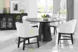 You've got a reservation for the hottest dining experience in town, and the Kendall collection is serving it family-style. A 59" round table anchors this trendy dining room, featuring a contemporary tabletop and flared pedestal base in a black finish. Matching side chairs with tapered wood legs showcase curved backs and seats fully upholstered in white for a crisp, tailored look.