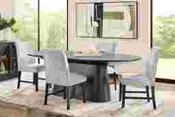 You've got a reservation for the hottest dining experience in town, and the Kendall collection is serving it family-style. This contemporary dining room features a trendy table with an oval-shaped tabletop and flared pedestal base crafted of oak veneers in a black finish. Four matching side chairs showcase channeling details stitched into gray upholstery for a crisp, tailored look.