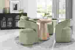 You've got a reservation for the hottest dining experience in town, and the Kendall collection is serving it family-style. A 48" round table anchors this trendy dining room, featuring a contemporary tabletop and flared pedestal base in a natural finish. Included side chairs, upholstered top to bottom in velvety sage fabric, bring a unique swivel base design to the table for contemporary flair and curved backs for lavish comfort.