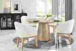 You've got a reservation for the hottest dining experience in town, and the Kendall collection is serving it family-style. A 59" round table anchors this trendy dining room, featuring a contemporary tabletop and flared pedestal base in a natural finish. Matching side chairs with tapered wood legs showcase curved backs and seats fully upholstered in white for a crisp, tailored look.