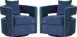 Take sophisticated style for a spin with the chic Kennedy swivel chair. Upholstered in soft velvet navy fabric, this contemporary chair features 360 degree swivel capabilities. Rounded track arms with cutout detailing offer a high end look that elevates any room. 100% Polyester.
