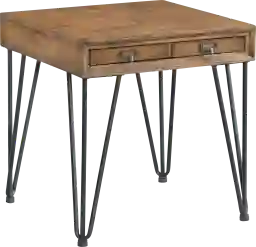 The Kennysaw brown end table is the perfect addition to your home. This square end table comes with a pull-out tray, ideal for a little extra space for your drink if you have too much decor on the table. The apothecary style tray fronts on this table add extra flair and pairs perfectly with the hairpin legs. The dark metal legs complement the light, walnut finish beautifully. Along the front edge, you'll find beveled edges adding a classic touch to this transitional design. Customer assembly is required.