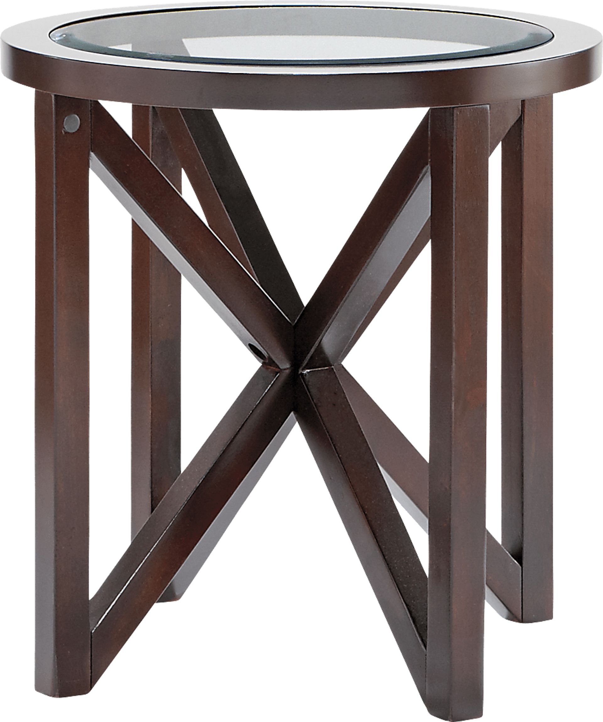 You'll love the transitional styling of our Kenshaw II end table. A round top of in-laid tempered glass with a beveled edge is supported by legs in an espresso finish. A crisscrossed table leg design adds to the transitional look.