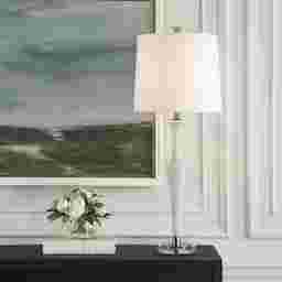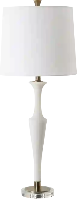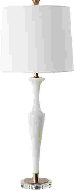 The Kercheval Road White Lamp adds an air of elegance and sophistication to any space. The base of the lamp is crafted from white man-made stone that accurately replicates the look of Thassos marble and is accented by plated antique brass details, displayed on a crystal foot. The tapered round hardback shade is covered in a white linen fabric. Partial assembly may be required.