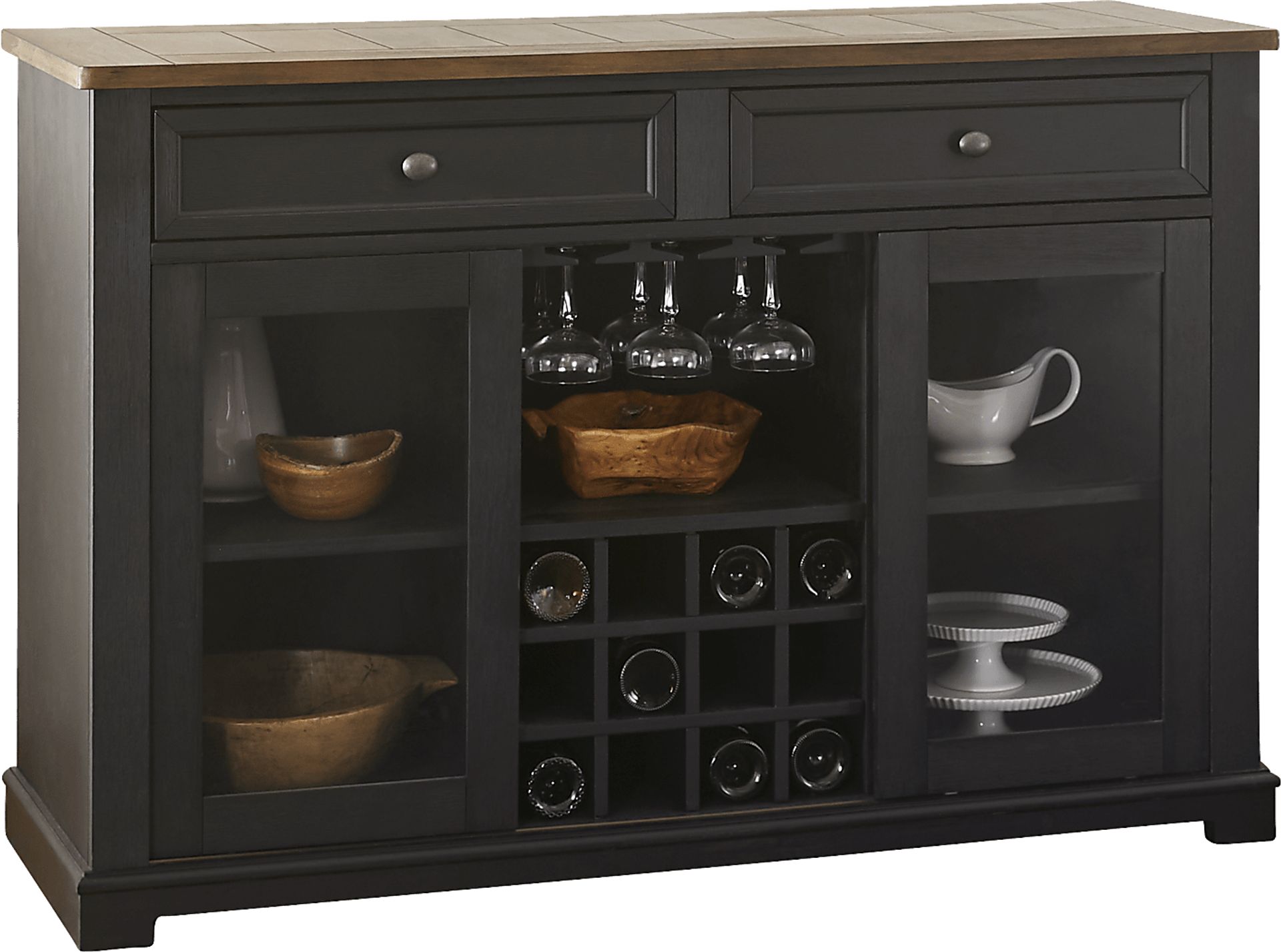 The Keston server is a dining room essential, thanks to its ample storage space and helpful organization potential. Made with wood solids and acacia veneers, the black finished base has wire-brushing details, while the oak finished top features plank styling for a charming farmhouse look. With multiple cubbies, two storage drawers, and dedicated storage for both wine bottles and glasses, this server is the perfect piece to help you organize linens, silverware, and all of your bar needs.
