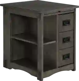 Clean-lined construction meets convenient storage in the classic look of the Ketura end table. Topped with a pull-out ledge, this 3-drawer unit is complemented by two open shelves along the right side, allowing you to stow away everything from accessories to stationary. Traditional handle pulls and curved carving add the perfect designer touch, creating the a stylish versatile look that you can enjoy for years to come. Customer assembly is required.