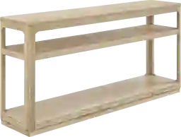 Enhance your living room or den with this sleek, minimalist modern Keyhan sofa table, expertly crafted from Malaysian oak and parawood. Its warm natural finish adds a touch of elegance. At 60-inches wide, this table is ideal for placement behind your sofa or couch. Or stage it in your entryway. It may also be placed beneath a wall mounted TV. Two open shelves are perfect for storing reading materials or displaying dcor. With its clean lines and rounded corners, this console table is a sophisticated yet practical centerpiece for any room. Customer assembly is required.