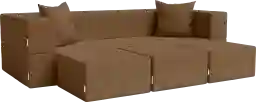 The three accompanying ottomans are the key to the set's versatility. They can be stacked inside the frame to create a large bench or a stable game table for activities. For a more functional lounging setup, one ottoman can be placed in the middle to serve as a built-in workstation or side table, while the others provide extra seating or footrests.