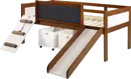 Our Algonac twin low loft with toy storage makes bedtime so much fun. With add-ons like a rope ladder, slide, toy boxes and chalkboard, your child will enjoy going to bed. Customer assembly required.