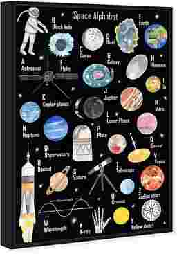 Let your little one's imagination blast off into outer space with Alphabet In The Sky wall art. Printed with premium inks on high-quality canvas reveals rich colors and fine details while resisting fade. Each canvas is hand-stretched and framed in a black floating frame. Customer assembly is required.