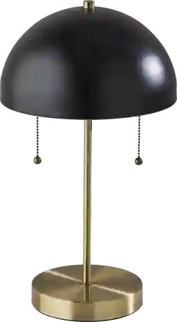 The 18 tall Anzio table lamp shines a light on vintage-inspired design in a mix of antique brass and black finishes. With its geometric symmetry and art deco flair, it is the perfect statement piece for desks, side tables, or nightstands. It features a sleek metal dome shade in black finish that curves like a canopy over the lamp's slender pedestal and round base, both featuring an antique brass finish. For convenient access to power right from your desk or table, the 6.5 diameter base features an AC outlet. Whether the lamp is turned on or off, the AC outlet will keep working normally. Operated by dual pull chains in antique brass finish to easily turn it on or off, the lamp powers two 40W bulbs not included and features a 5' clear cord. Customer assembly required.