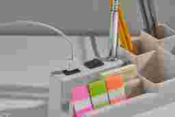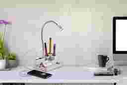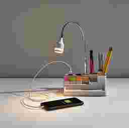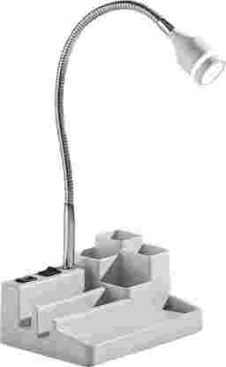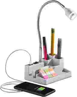 A practical solution that will liven up the office, this LED Arkell table lamp has several ways to improve efficiency and organization. A long, brushed steel, gooseneck arm allows for 240 lumens of flicker free, energy efficient LED lighting to reach numerous areas of the desk. A sleek, white finish on the shade and base offers a modern update to your desk style. An LED light band on the shade widens and intensifies the light. Turn the lamp on and off with a convenient rocker switch on the base. There are 2 organizational slots as well as 1 USB port to facilitate storing and charging of tablets or mobile devices. Store extra knick knacks or pens & pencils in one of the 5 other small storage trays included on the base. This lamp has a clear power cord and is smart outlet compatible. The LED bulb is integrated into the lamp and is not replaceable, but lasts 50,000 hours. Customer assembly required.
