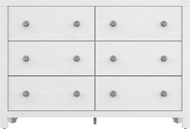 Help organize and store your child's belongings with the stylish and practical Barringer Place dresser. Wood solids in a beautiful white finish features cerusing detail to add a unique appearance. Six drawers with chrome finished hardware provide ample storage.