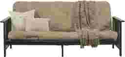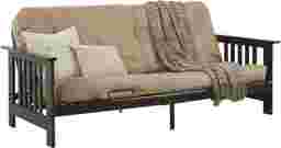 The Bellwood futon is not only a trendy place to sit, but an excellent spot for relaxing or lounging. Simply open the spring loaded hinge to fold out the sofa into a full sized foam bed (sold separately), perfect for an unexpected guest or sleepovers. A slim profile constructed from wood solids in a black finish features vertical slat lines for a sleek contemporary look. Its compact size makes it a great addition to any guest room, small apartment, or even a dorm room. Futon mattress sold separately. Accent pillows and blanket not included. Customer assembly required.