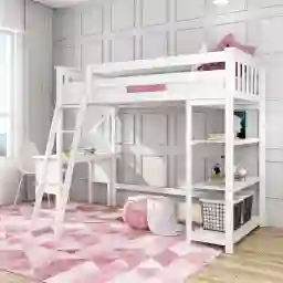 The integrated workstation is designed to foster a focused environment for homework and crafting. By nesting the desk and bookcase directly under the bed frame, it creates a dedicated "niche" that feels separate from the rest of the room. This layout is particularly helpful for keeping school supplies and books organized in one location, helping to maintain a tidy and productive living space.