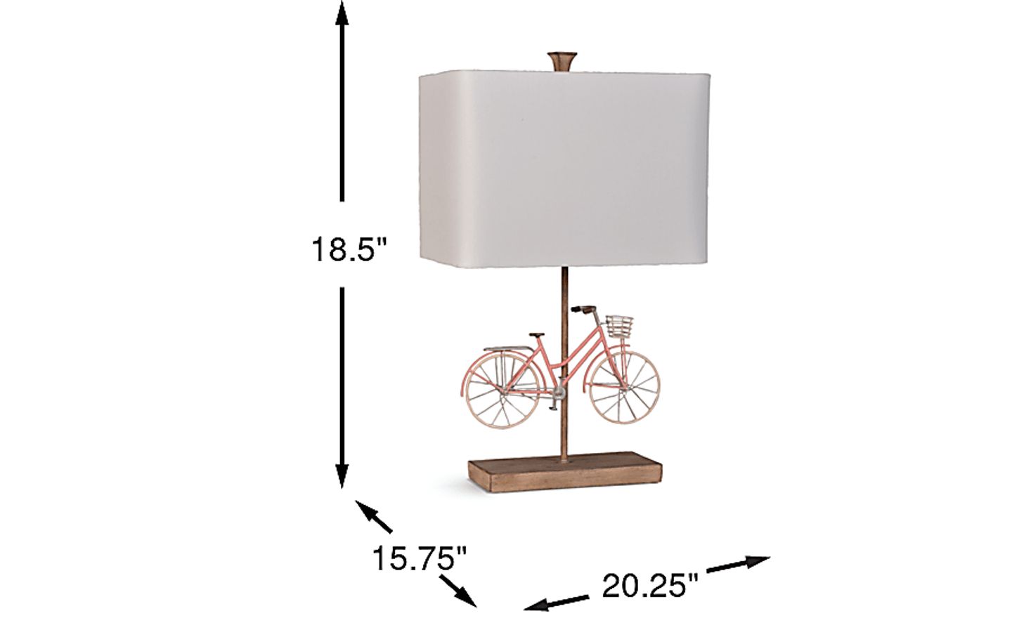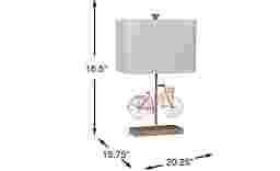 A fashionable choice to light up your room, the Bicycle Ride table lamp is not only adorable, but functional, too! Styled after a vintage ladies bike, the metal bike's frame features a basket, non-movable pedals, and even a luggage carrier above the back wheel. The polyresin faux wooden base keeps it from tipping over, while providing a warm complementary tone to the pink bike. This lamp can accommodate one maximum 100 watt bulb (not included) with a 3-way switch. Topped with a rounded rectangular hardback shade, it's a charming lamp with plenty of personality.