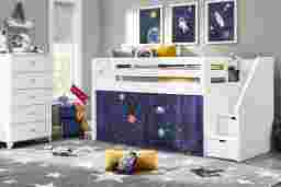Launch into dreamland and turn bedtime into a space-age adventure with the Blast Off collection! Playing pretend is out of this world with the space-themed fabric that dresses the loft's white frame. What's a cool new room if you can't keep it clean? Handy storage is built into the loft's steps with room for clothes, toys and more. Additionally, the steps can be affixed to either side of the piece. The removable, magnetic, dry-erase board provides the perfect activity panel for learning, drawing or even leaving a good morning message for your child to wake up to! Mattress and foundation (if required) sold separately. This product requires a bunkie board (sold separately).