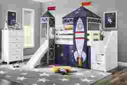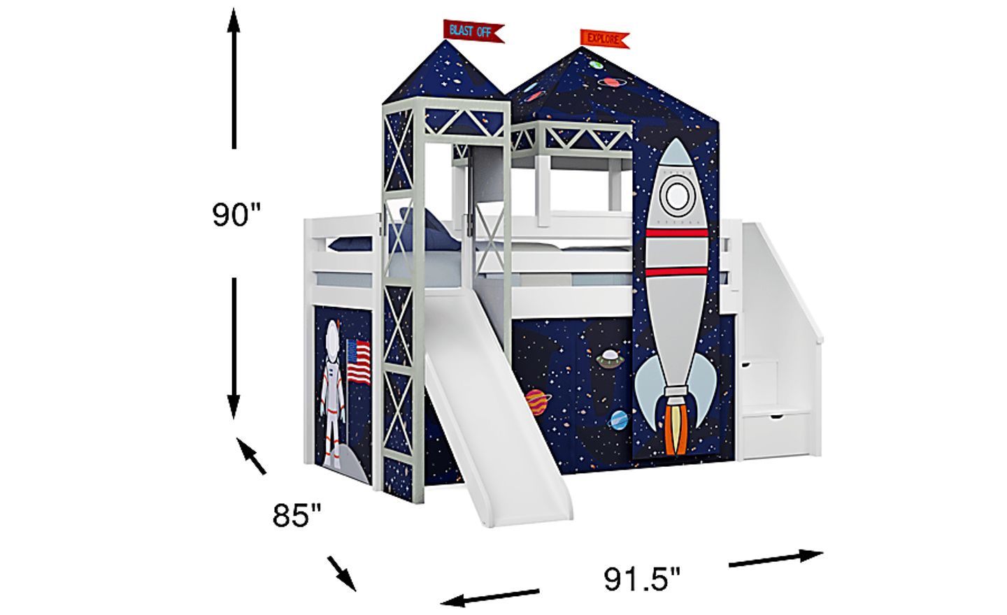 Launch into dreamland and turn bedtime into a space-age adventure with the Blast Off collection! Playing pretend is out of this world with the space-themed fabric that dresses the loft's white frame. Taking the fun over the top, the tower and tent propel the exciting design to even greater heights with the appearance of a rocket and flags that crest over the canopies. The space chute gives kids a fun way to slide out of bed in the morning. When not in use, the slide can be stored separately from the frame to save space. What's a cool new room if you can't keep it clean? Handy storage is built into the loft's steps with room for clothes, toys and more. Additionally, the steps can be affixed to either side of the piece. Mattress and foundation (if required) sold separately. This product requires a bunkie board (sold separately).