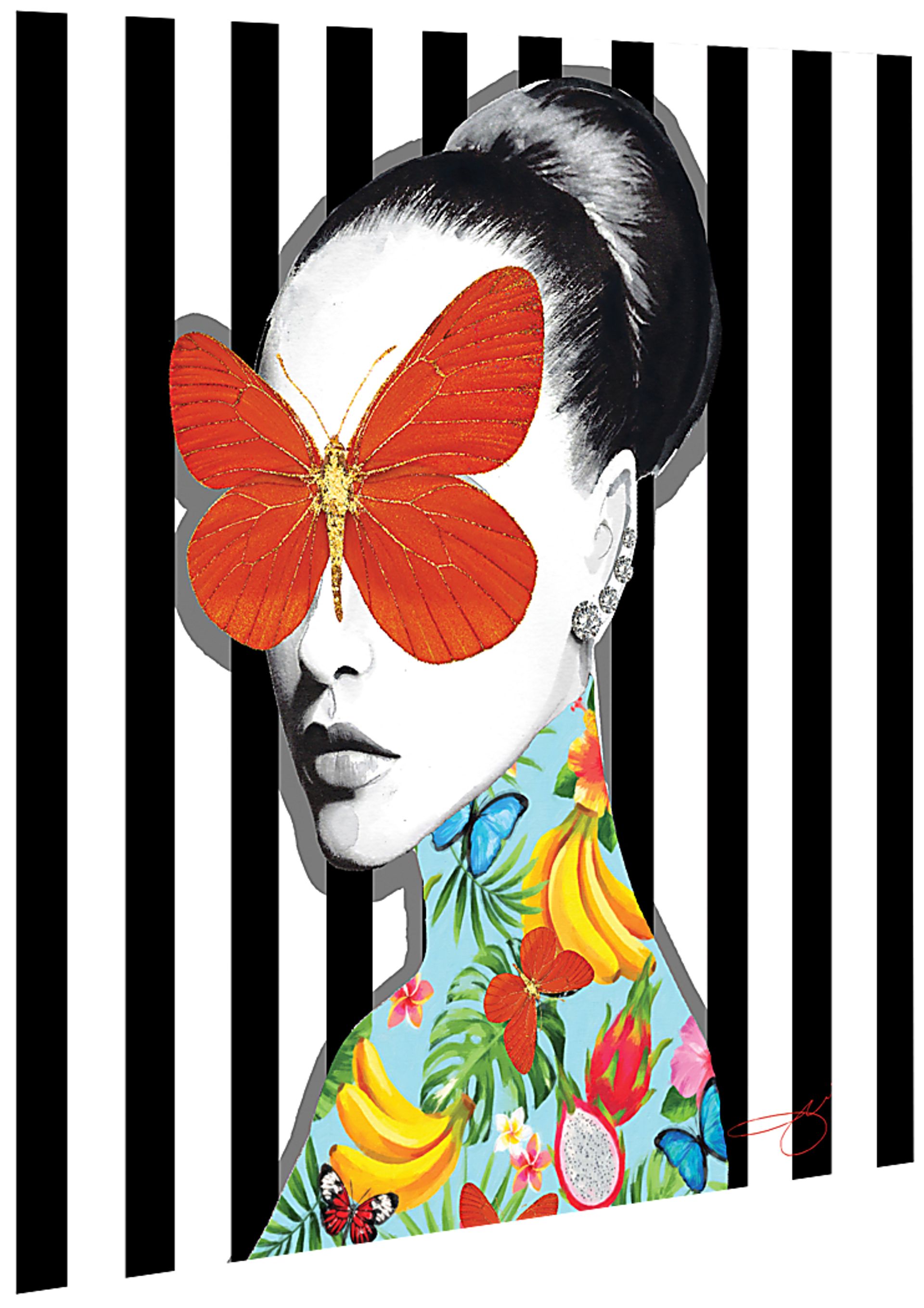 This piece of printed, frame-less, free floating, tempered glasswas inspired by the French technique of Verre Eglomise in which artist's literally painted the back of clear glass so that when viewed from the front the painting is brought to life under the depth of the glass. Blinded By Butterfly has imagery of this beautiful woman and her unique butterfly eyes, which is transformed into incredible wall art. Customer assembly required.