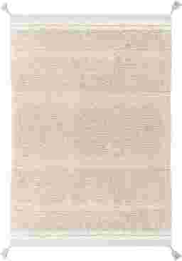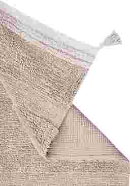 This unique artisan rug is 100% machine washable and sustainably handcrafted in our own factory using natural fibers. The canvas base adds texture through rows of varying pile heights. The rug comes in a soft rose color, accented with contrasting border lines in nude and natural and a delicate embroidered detail over the bare canvas. Small tassels at each corner complete the handcrafted look with a charming finish.