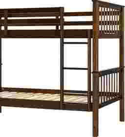 Cabin fever will never get you down with this Bobterry twin-over-twin mission bunk bed. Perfect for the house at the lake, the kids bedroom, or your small-space apartment, the solid pine wood bedframe stands sturdy no matter the situation. An integrated ladder makes summer vacations in the woods or ski trip accommodations safe and sound. And the slatted head and footboard add a warm feel to your home-away-from-home or your nightly stomping ground. Customer assembly is required.