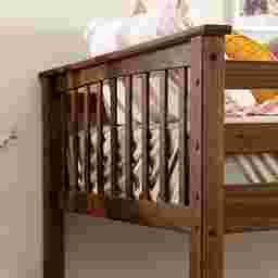 The mission style is defined by its clean, vertical slats and sturdy, straight-line construction. This transitional design, paired with a rich walnut finish, allows the bed to blend seamlessly with both traditional and modern decor. It provides a warm, classic feel that works well in a dedicated kids' room or as versatile guest accommodations in a vacation home.