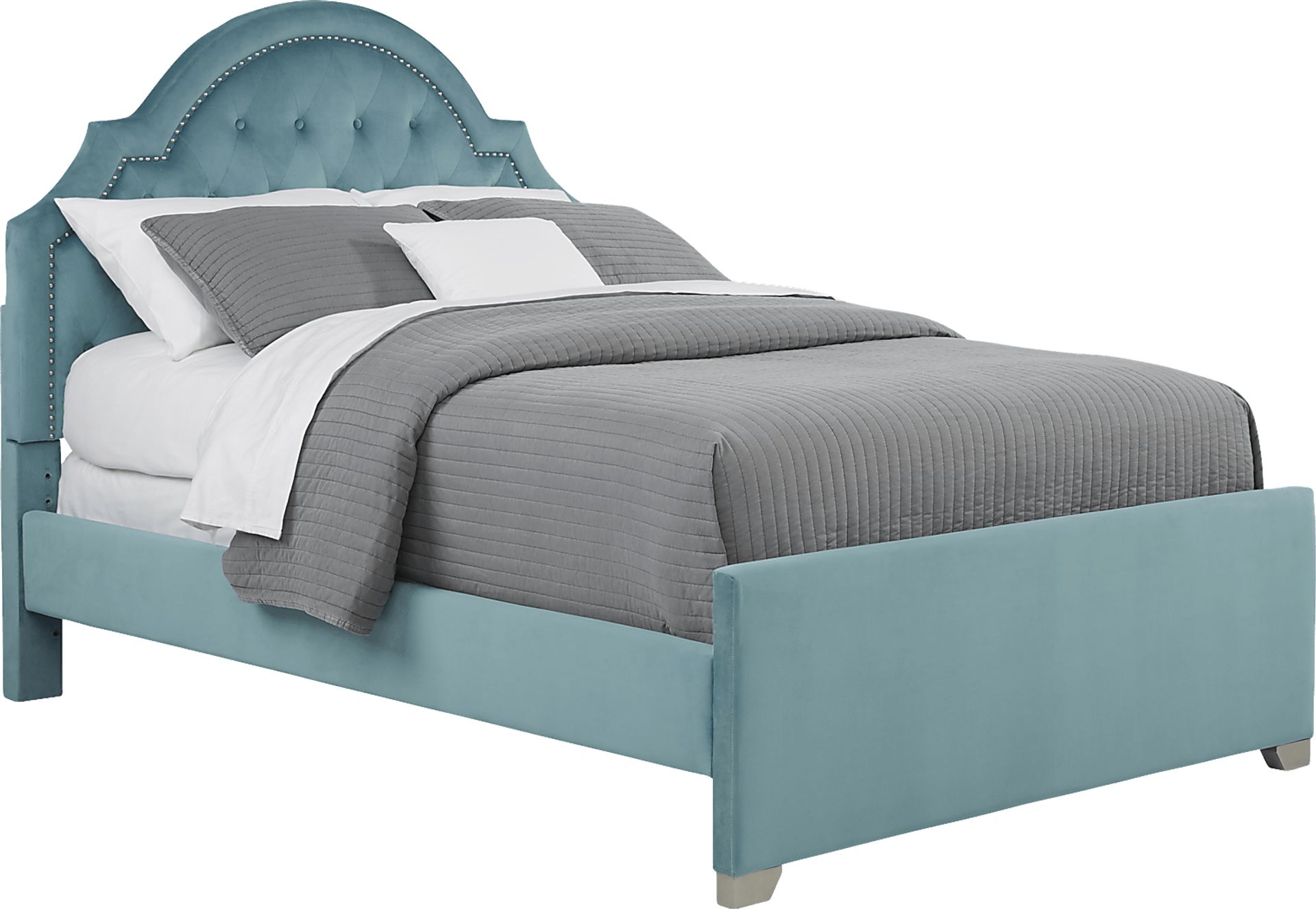 Regal detailing and a pretty teal color make the Braelynn bed the perfect option if you're looking to add a little feminine flair to your guest room or child's bedroom. The headboard features nailhead trim and beautiful tufting details, while the velvet upholstery adds a touch of sophisticated softness. Mattress and foundation (if required) sold separately. Bed shown is full size.