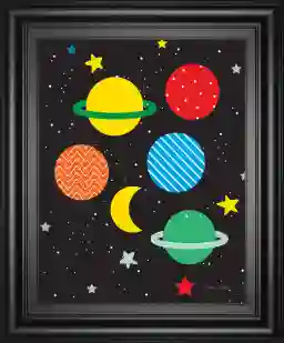 The Bright Planets artwork will inspire your little astronaut to keep studying about space. The fun bright planets in deep dark space are quite a decor choice for his galaxy inspired room. This art features a 3 inch wide frame and a real glass. Customer assembly is required.