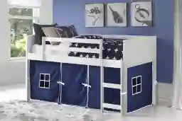 The Camp Hideaway white twin Jr. loft bed with blue tent makes a great space saver with either under-bed storage or a fun playhouse area. The stable design has a built-in ladder, slatted side rails, and a louvered headboard and footboard. The tent fabric, which can be removed for easy cleaning, features two windows and a flap-style door with tie closures. Let your little dreamer's imagination run wild in this enchanting loft bed. Customer assembly required. Machine wash tent fabric in cold water on gentle cycle. Customer assembly is required.