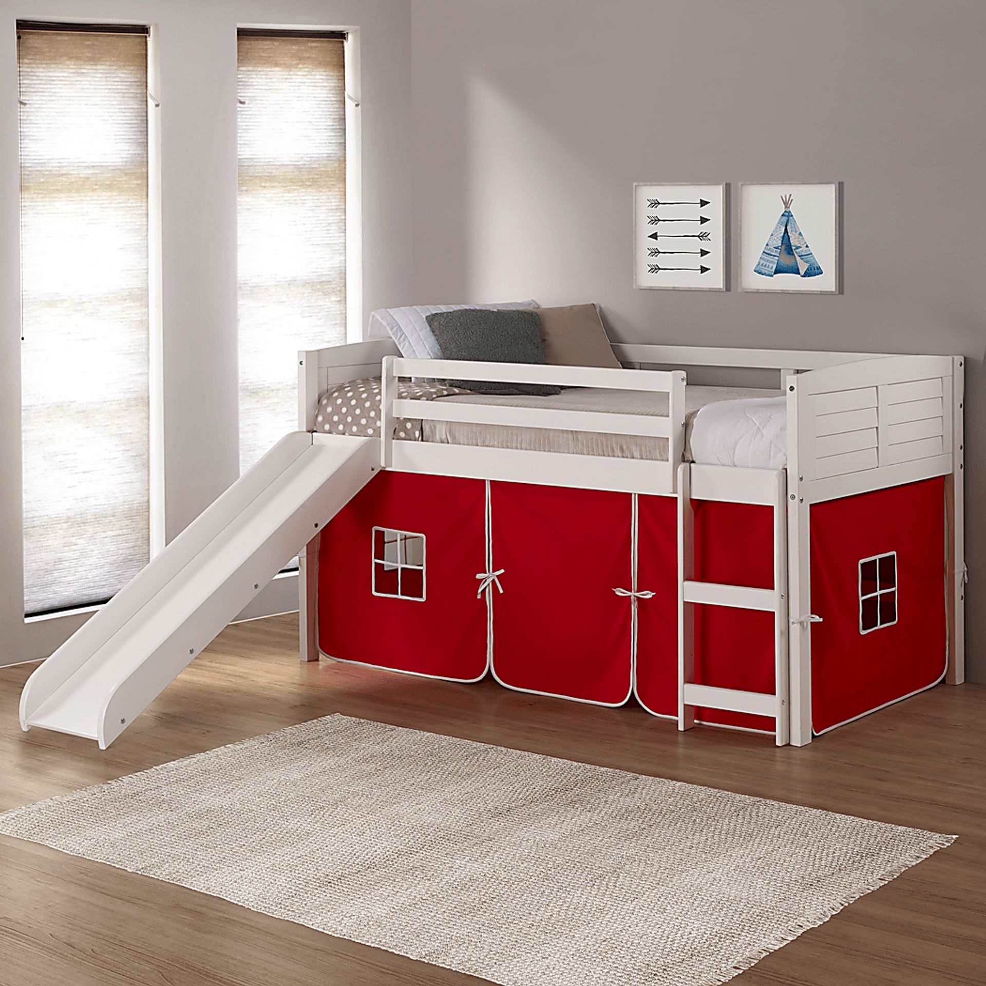 The Camp Hideaway twin louvered low loft bed with red tent makes a great space saver in an active kids room. The underbed space can serve as a storage or a fun play area. This bed comes in a true white finish that will match the rest of the white furniture in the room. The red tent fabric can be removed for cleaning. The slide is a great way to start a day for any kid. Customer assembly is required.