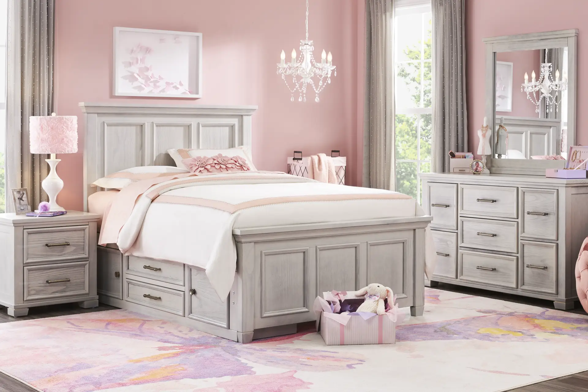 Give your child an awesome new bedroom with the Canyon Lake collection. Featuring a classically styled panel headboard that can match any sort of room decor, the bed is crafted of pine and poplar solid wood with pine veneers. A storage side rail with two cabinets and drawers provides space to store even more. The coordinating dresser features seven drawers, each constructed with French dovetail joints in the front. Side mounted, ball bearing glides ensure the drawers smoothly open and close. The mirror mounts to the dresser. Clean ash gray finish, enhanced with a wire brushed texture, offers incredible dimension alongside the metal hardware's antique silver finish for the perfect final look. Mattress and foundation (if required) sold separately.
