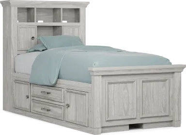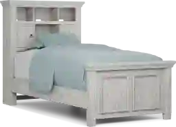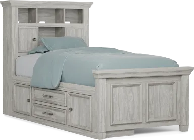 The potential for awesome new adventures is always close at hand when you choose the Canyon Lake bookcase bed for your little bookworm. Crafted of pine and poplar solid wood with pine veneers, this bed's brilliant design captures the look and feel of casual, quaint cottage living. Shelving on the headboard is equipped to house hardbacks, paperbacks, comics and so much more. Sliding doors offer additional storage with cubbies hidden away for quick and seamless access. Integrated wire management holes even allow you to run cables to power sources for electronic devices. Framed panel details on the footboard supply a classic charm that pairs perfectly with a variety of styles. A clean ash gray finish, enhanced with a wire brushed texture, provides the perfect final detail for the ultimate bookcase bed. Mattress and foundation (if required) sold separately.