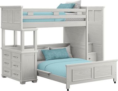 Maximize space with the Canyon Lake bunk. Featuring a classic design that is sure to stay in style, this piece provides space for sleep while opening the room up for activities. Crafted with pine veneers in an ash gray finish this bunk is durable and safe for kids. A step attachment (adjustable to either end) provides safe access to the top bunk and has built-in storage drawers to maximize space. This bunk features a built-in dresser at one end for handy storage that saves space! Bunkie boards required. Mattresses and foundations (if required) sold separately.