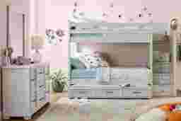 Maximize space with the Canyon Lake bunk. Featuring a classic design that is sure to stay in style, this piece provides space for sleep while opening the room up for activities. Crafted of pine solids and veneers in an ash gray finish this bunk is durable and safe for kids. A step attachment (adjustable to either end) provides safe access to the top bunk and has built-in storage drawers to maximize space. Additional configurations offer built-in dressers, desks and more as practical attachments! Bunkie boards required. Mattresses and foundations (if required) sold separately.