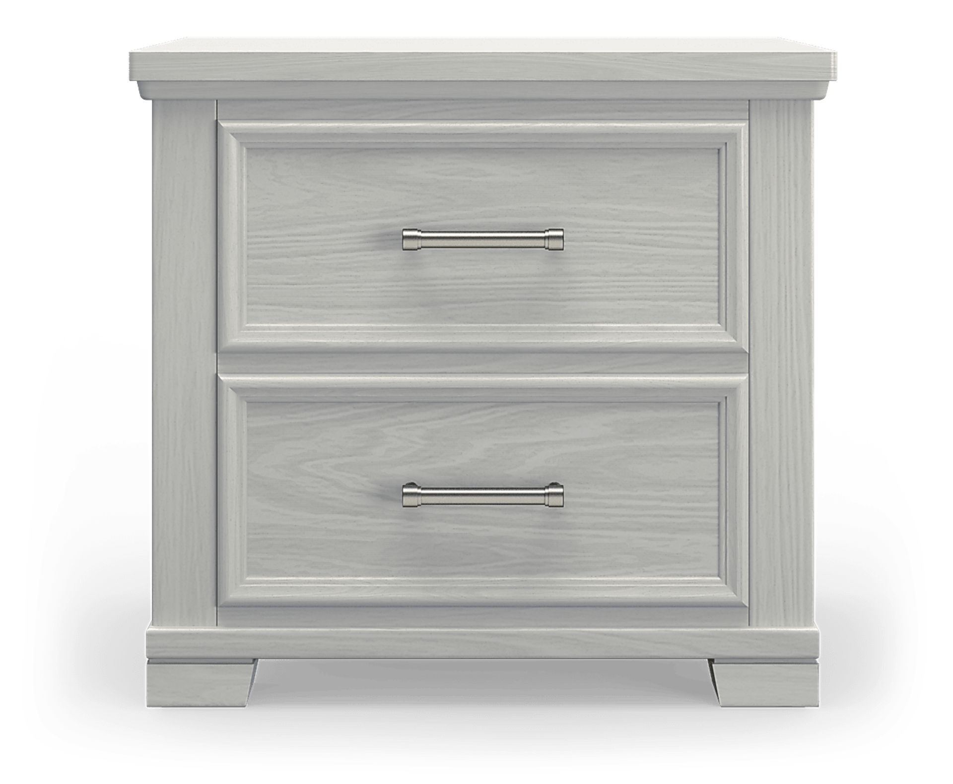 Keep books, lamps and more close at hand with the Canyon Lake Nightstand. Two drawers with industrially inspired metal hardware pulls provide ample storage and durable pine solid and veneer construction with an ash gray finish.