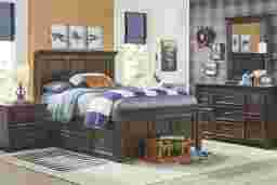 Give your child an awesome new look with the Canyon Lake panel bed. Crafted of pine solids and veneers, this collection stands out thanks to its durable and attractive design. Framed panel details on the headboard and footboard supply a classic charm that pairs perfectly with a variety of styles. A storage side rail with two cabinets and a pair of drawers provides extra bedside space for your loved one to store some of their favorite things. The rich brown java finish, enhanced with a wire brushed texture, provides the perfect final detail for the ultimate panel bed. Mattress and foundation (if required) sold separately.
