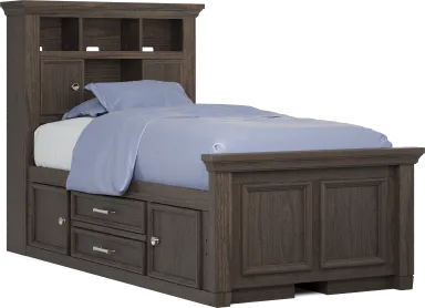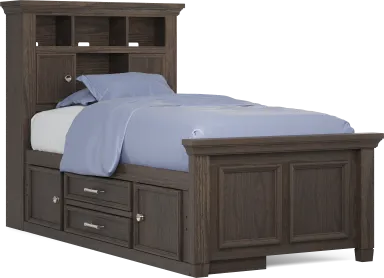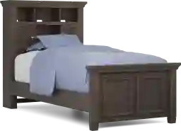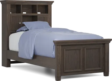 The potential for awesome new adventures is always close at hand when you choose the Canyon Lake bookcase bed for your little bookworm. Crafted of pine and poplar solid wood with pine veneers, this bed's brilliant design captures the look and feel of casual, quaint cottage living. Shelving on the headboard is equipped to house hardbacks, paperbacks, comics and so much more. Sliding doors offer additional storage with cubbies hidden away for quick and seamless access. Integrated wire management holes even allow you to run cables to power sources for electronic devices. Framed panel details on the footboard supply a classic charm that pairs perfectly with a variety of styles. A rich brown java finish, enhanced with a wire brushed texture, provides the perfect final detail for the ultimate bookcase bed. Mattress and foundation (if required) sold separately.
